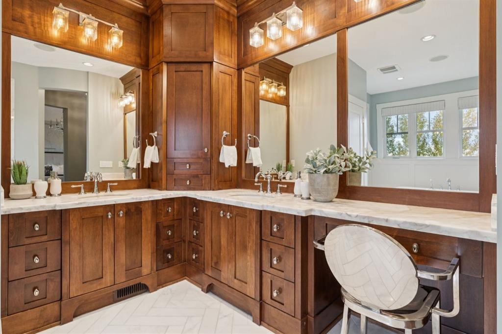 Outside, the property unfolds like a private park, an achievement of landscape architecture rarely seen at this scale. The Rocky Mountain inspired waterfall and meandering creek set a tranquil tone as they flow beside the expansive poured aggregate patio, surrounded by towering evergreens and deciduous trees, layered greenery, and meticulously crafted stonework. The result is a lush, immersive environment that feels alive in every season.